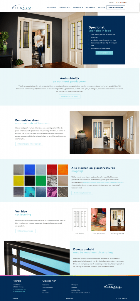 De website van vitralo was in een CMS gebouwd dat weinig gebruiksvriendelijk was. De oude webontwikkelaar was ermee gestopt en Vitralo wilde graag de website overzetten naar WordPress. We hebben de situatie in 2 stappen aangepakt. De eerste was het letterlijk overzetten van de data naar WordPress toe, rekening houdend met stap 2, waarbij we de website zouden overzetten in een Webshop zodat ook consumenten direct konden bestellen. Later volgde nog stap 3: het glas in lood werd inclusief deuren en ramen verkocht. Hiervoor zou een complexe rekenmethode voor geïmplementeerd moeten worden.